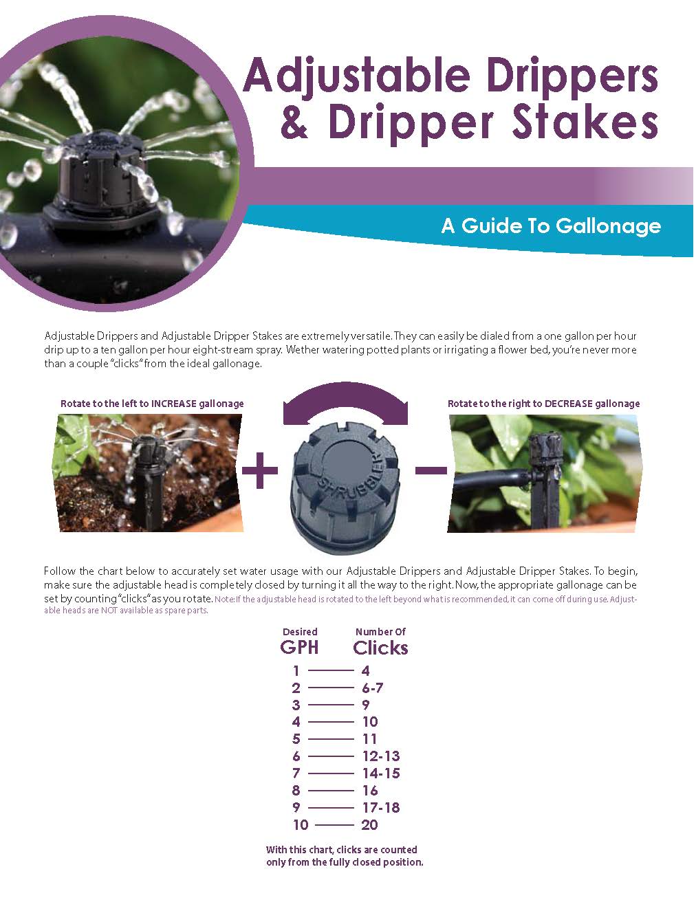 Our Newly Designed Adjustable Dripper Stake is adjustable by turning the Top Dial to water from 0 to 10 GPH. Turn the Top to increase output from a drip up to a 2-ft eight-stream pattern. The Newly Designed Top Dial has a built-in positive "Stop" feature that prevents a cap from blowing off easily if the top is rotated too far to the left.