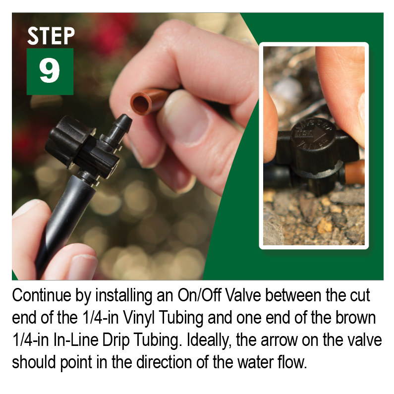 5 of the 1/4-in On/Off Valves can be used to turn on and off water supply to the 1/4-in In-Line Drip Tubing that runs to the various seasonal vegetables.